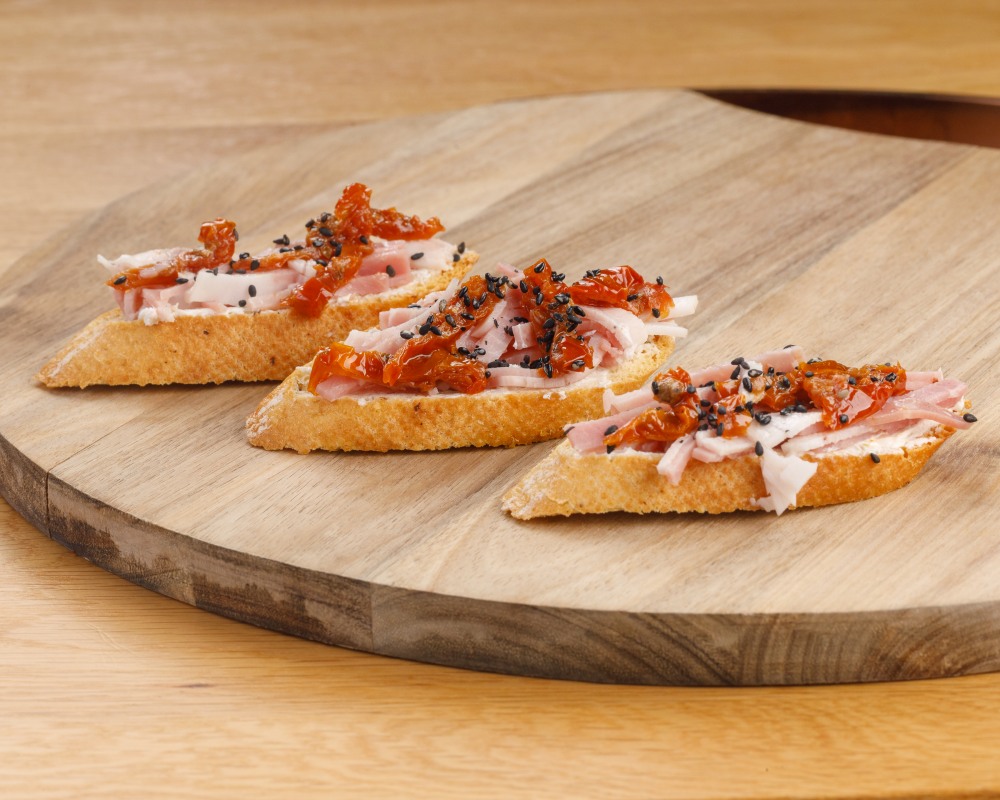 Брускета, крема сирене, прошуто котто, сушени домати, сусам