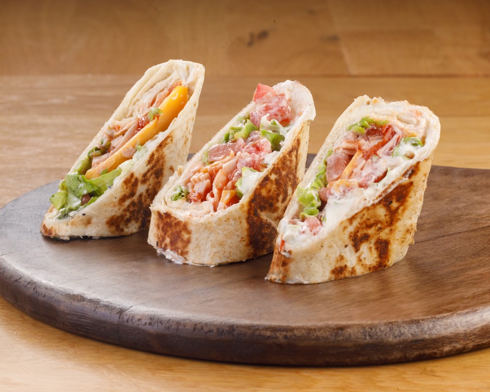 Тортила питка, крема сирене, пуешко филе, чедър, домат, айсберг, червен лук, маслини, доматена салца